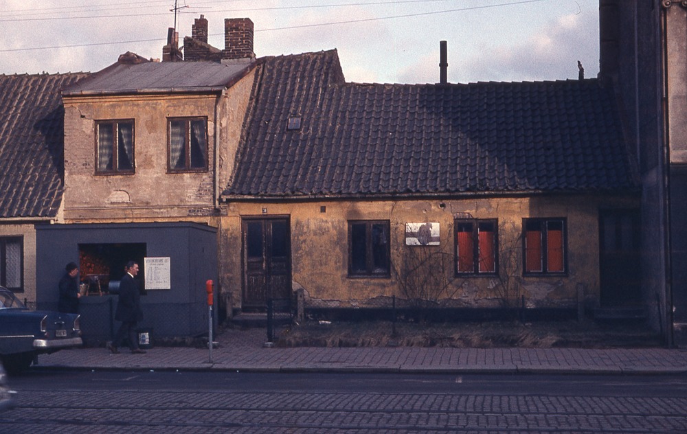 I förgrunden gata. I bakgrunden en- och tvåplanshus. Framför står ett tombolastånd.