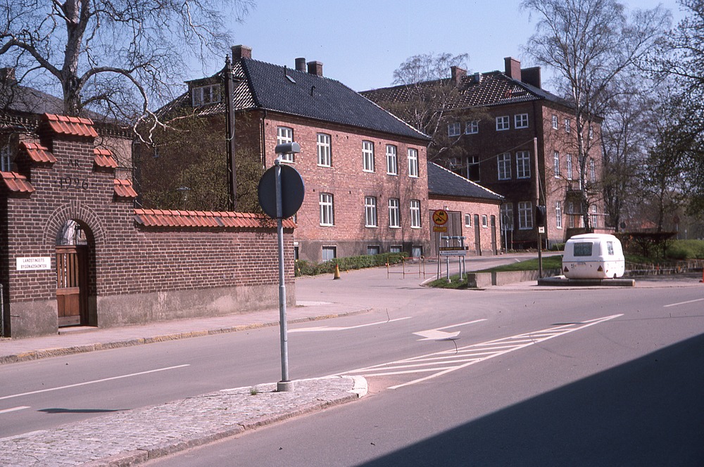 I förgrunden en stadsgata. Till vänster en hög mur med port. I bakgrunden två- och flervåningshus. Gamla lasarettets framsida.