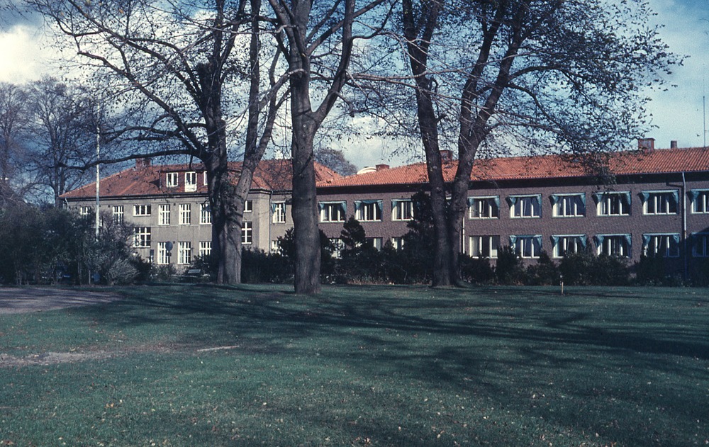 I förgrunden gräsmatta och stora träd. I bakgrunden tvåvåningsbyggnad