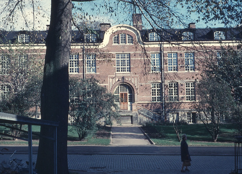 I förgrunden park med gångbanor, gräsmattor och träd. I bakgrunden trevåningsbyggnad med vind