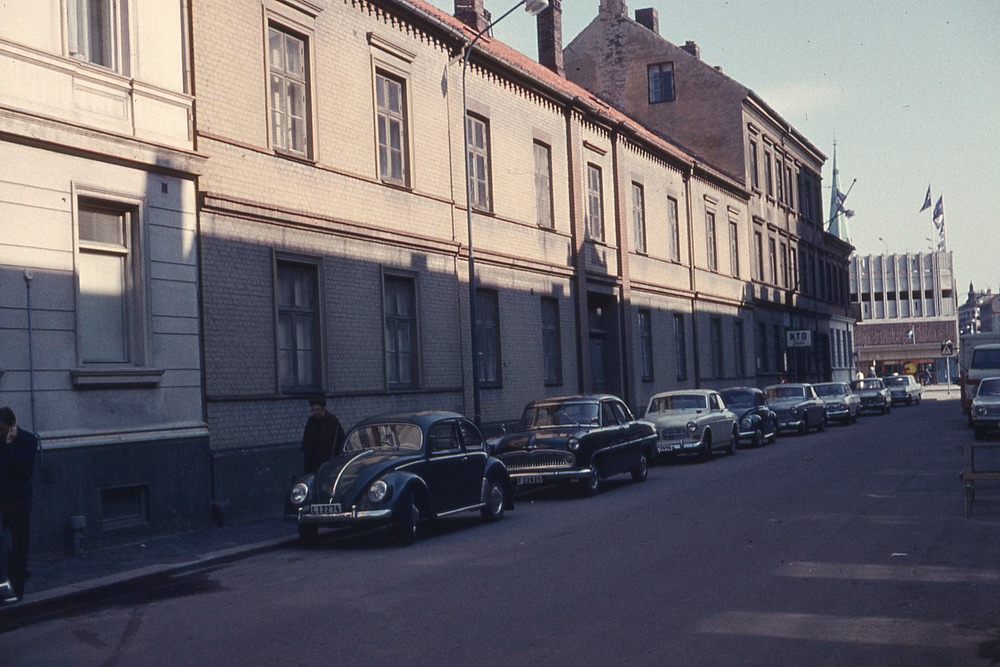 I förgrunden stadsgata. I bakgrunden två- och trevåningshus med bilar parkerade framför
