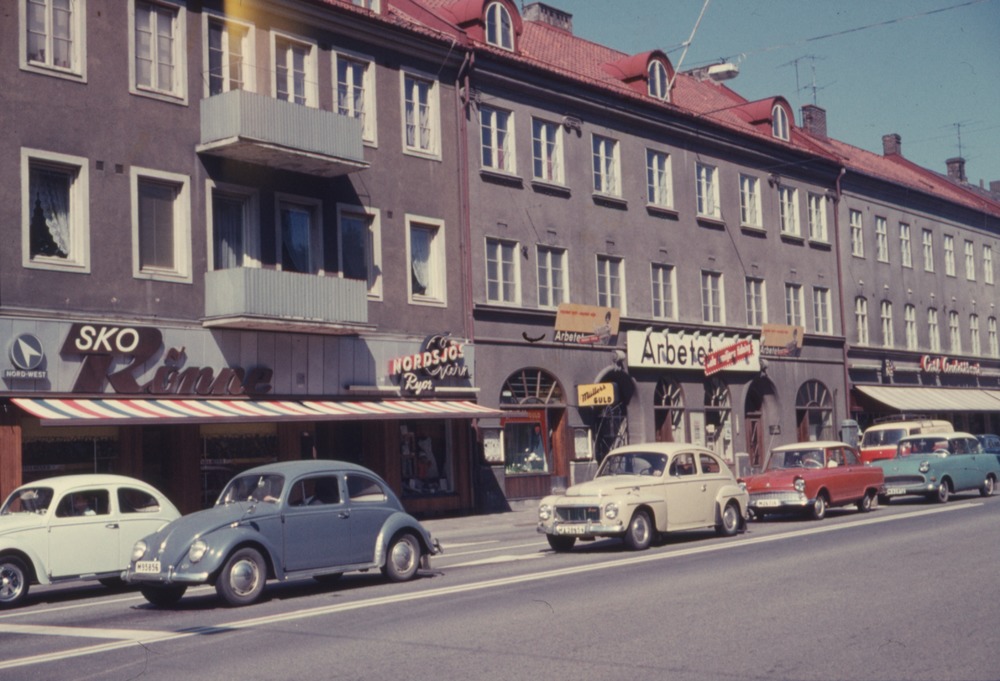 I förgrunden stadsgata. I bakgrunden trevåningshus med butiker i bottenplanet. Det står bilar parkerade framför husen. På en skylt står det Sko Rönne och på en annan Nordsjö
