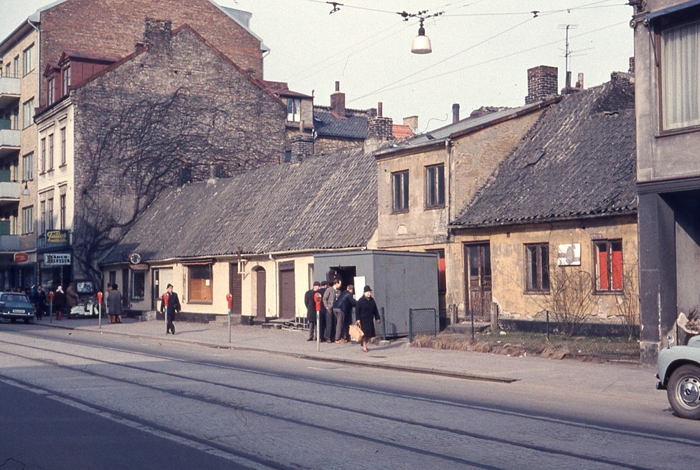 I förgrunden gata. I bakgrunden enplanshus i mitten. Flervåningshus till vänster och tvåplanshus till höger. Framför mittersta huset ett tombolastånd. Utmed gatan parkeringsautomater. På en skylt står det blommor.
