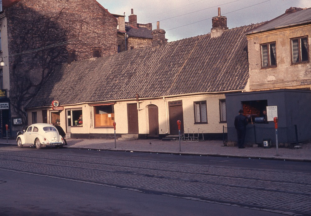 I förgrunden gata. I bakgrunden enplanshus i mitten. Flervåningshus till vänster och tvåplanshus till höger. På en skylt står det blommor. Till höger ett tombolastånd. Och så står där parkeringsautomater.