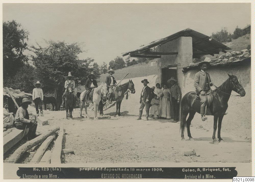Män på hästar utanför byggnad, Estado de Michoacan (delstaten Michoacan).