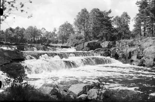 Vattenfallet Flammafallet i Krokån, norr om Knäred. Vattnet forsar över fyra "trappsteg" och fallet är omgivet av träd.
