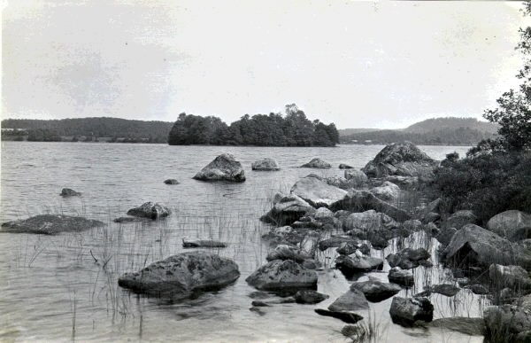 Stenig strandkant i Sjönevadssjön med vy mot ön med lämningarna av Sjönevadsborg.