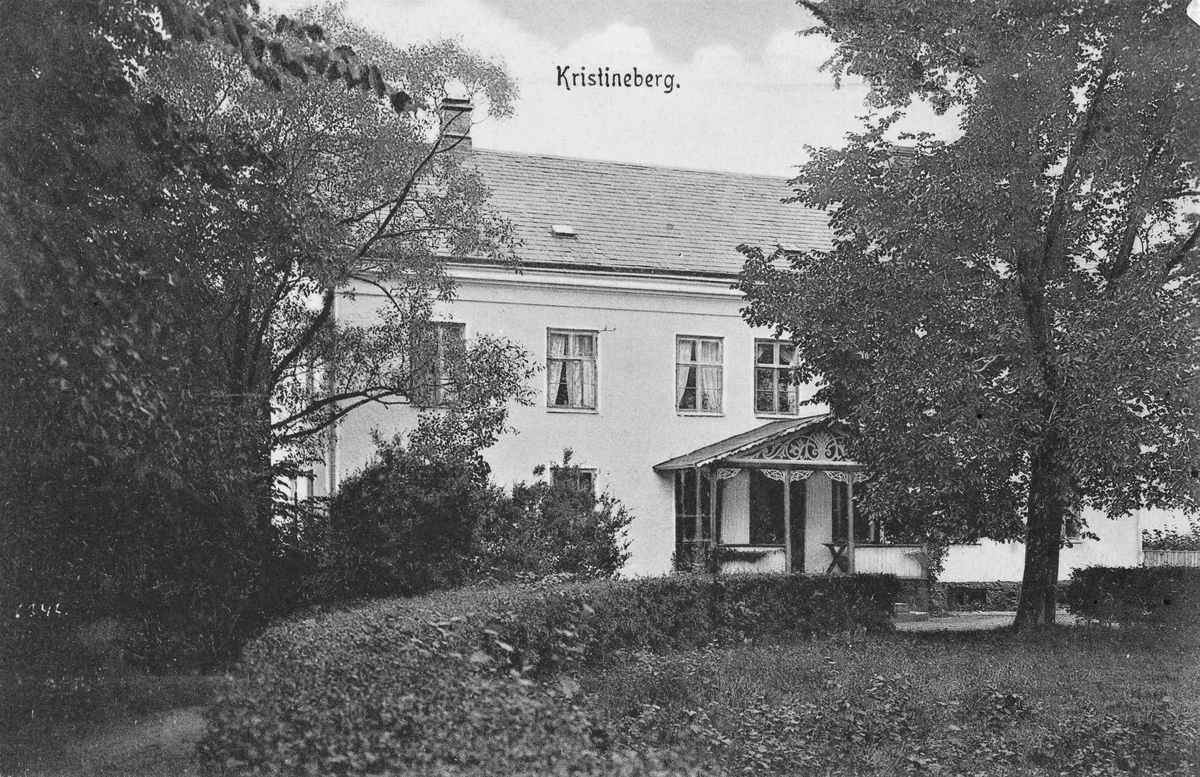 Vykort, "Kristineberg". Mangårdsbyggnad med veranda, med figursågade dekorationer, och trädgård i förgrunden. Fotograferat efter 1905. (Uppgifter om ort saknas, men sannolikt i nuvarande stadsdelen Kristineberg väster om dagens centrala Halmstad)