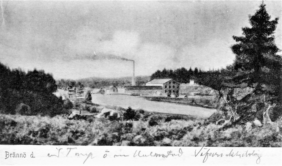 Brevkort, "Brännö d....vid Torup ö. om Halmstad. Väfveriaktiebolag." Brännögård ligger ca fem kilometer norr om Torup, där kraft från Kilans (biflöde till Nissan) vattenfall började tas i anspråk redan på 1700-talet för kvarndrift. År 1901 grundades Brännö Väveri AB och ett bomullsväveri ersatte då kvarnen samt ett sågverk med spånhyvel från 1800-talet. Fabriken hade 248 vävstolar och ända upp till 150 personer var anställda. Bostäder byggdes, så kallade kaserner. 1935 lades väveriet ner och i slutet av 1930-talet övertogs lokalerna av AB Isacsons Wellemballage i Göteborg som blev bestående på orten.