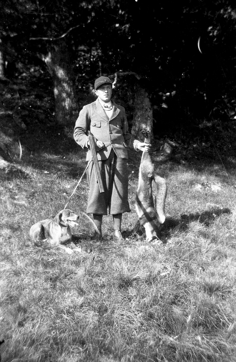 Evert Halltorp från Hallagård Rolfstorp står i en skogsglänta med gevär, jakthund och en skjuten räv.