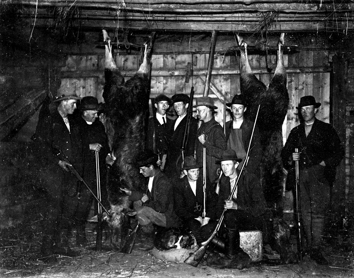 Jaktlag i en lada tillsammans med två upphängda, skjutna älgar. Männen håller i sina gevär och framtill ligger en jakthund. Troligen på Skällinge, som fotografen var ifrån