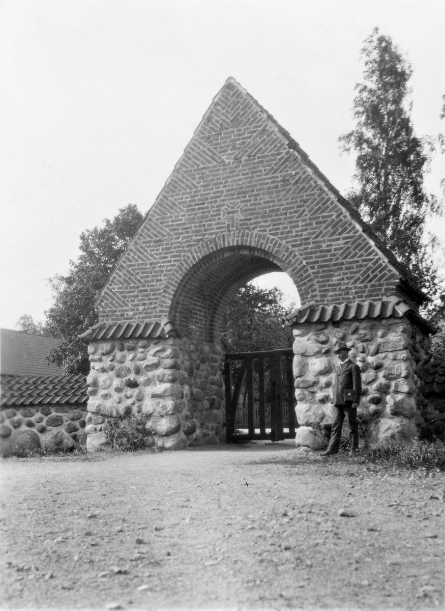Katolska kyrkans stiglucka i Oskarström. Till höger står en man i hatt med kikarväska. Stigluckan har fundament av murade naturstenar och gavlar med mönstermurat tegel. En rustik trägrind sitter i det rundbågade valvet. Tegeltäckta naturstensmurar utgår från stigluckan.