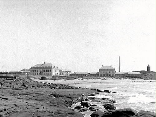Vy över klippig strand med Kustsanatoriet Apelviken i bakgrunden och till höger ett vattentorn. förgrunden
