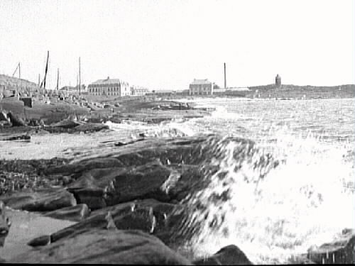 Strandvy. Klippor och vågor med Kustsanatoriet Apelviken och ett vattentorn i bakgrunden.
