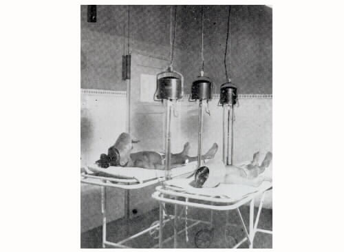 "Finsenbestrålning" av patienter i ett behandlingsrum på Kustsanatoriet Apelviken. Bestrålningen var en av behandlingsformerna och krävde skärmar över huvudet som skydd.