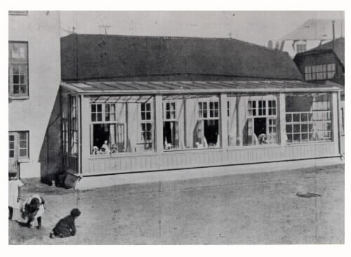 Exteriör av solveranda på Kustsanatoriet Apelviken. Några barn hänger ut genom de öppna fönstren och några leker till vänster på utsidan.