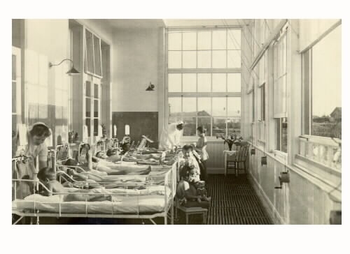 Interiör av solverandan på 3 B, Kustsanatoriet Apelviken. Personal och patienter i sina sängar.