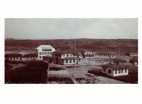 Vy över Kustsanatoriet Apelviken med rabatter och/eller odlingar i förgrunden. I bakgrunden reser sig bergen.