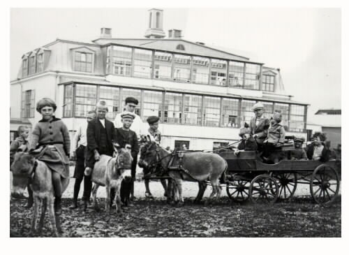 "Lek med åsnorna". Barn med tre åsnor och kärra framför avdelning 3 på Kustsanatoriet i Apelviken under 1920-talet.