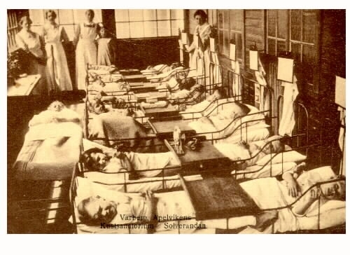 (TBC-sjuka) barn ligger i bäddar på solverandan. Längst bort står några sköterskor och en flicka.