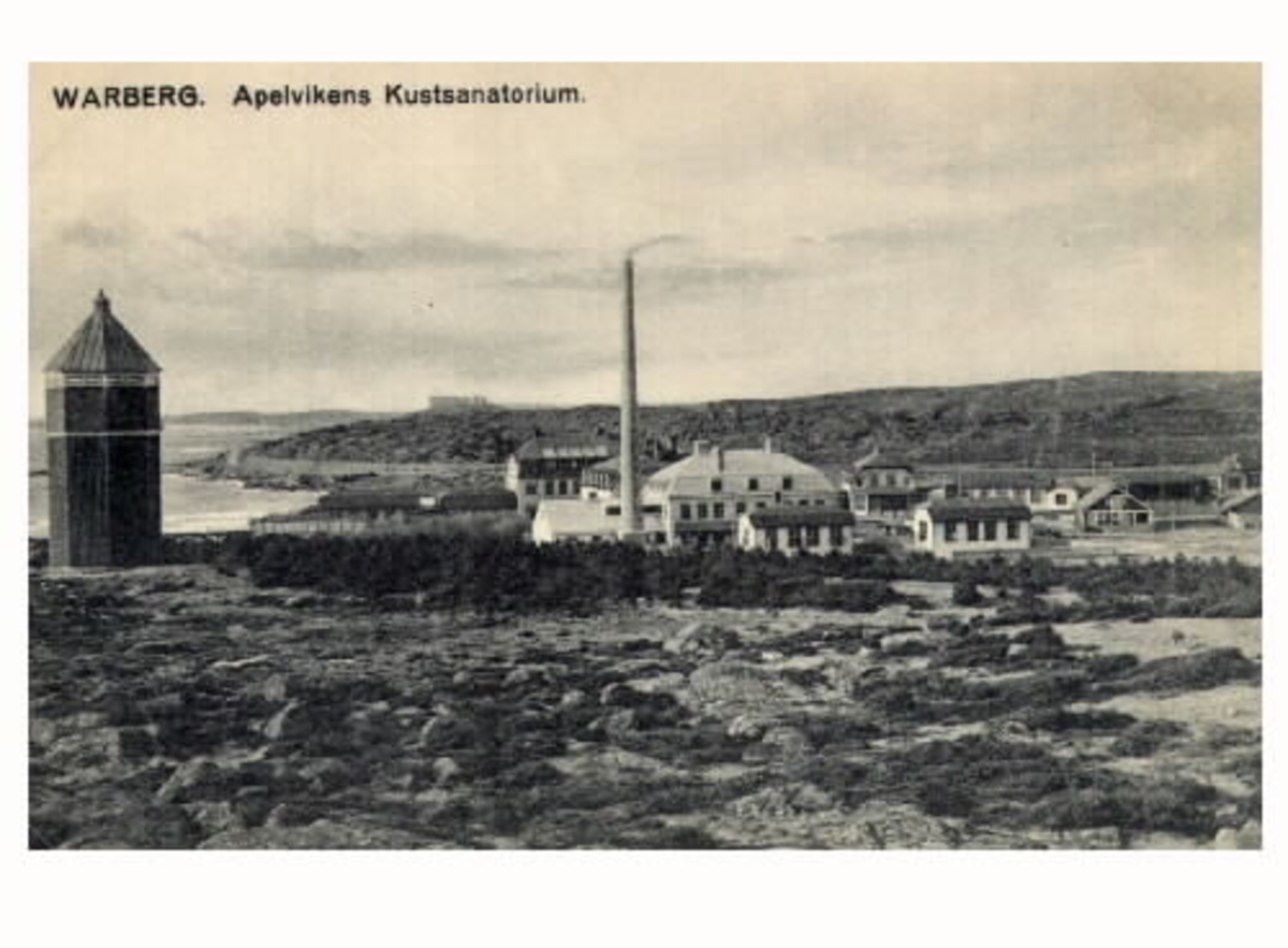Vykort, "Warberg. Apelvikens Kustsanatorium:" Vy från Subbeberget över Kustsanatoriet Apelviken. Till vänster ses ett vattentorn och i bakgrunden Varbergs fästning.