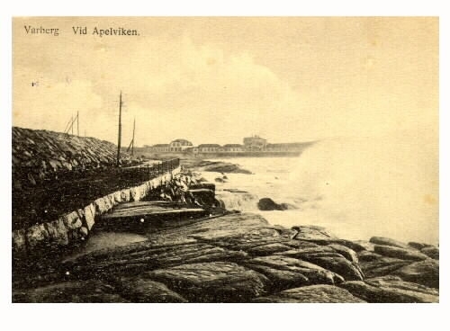 Viykort med motiv från Apelviken, Varberg. Havsstrand med vågor och klippor. I bakgrunden syns Apelvikens kustsanatorium.