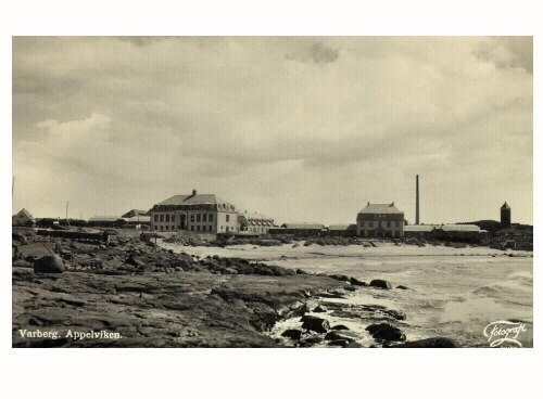 Vykort, "Varberg. Appelviken". Utsikt över Apelvikens sanatorium med berghällarna i förgrunden. På bilden syns vattentornet uppfört 1916. Bilden tagen före 1926.
