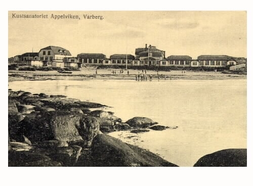 Vykort, "Kustsanatoriet Appelviken, Varberg." Utsikt över Lilla Apelviken och sanatoriets byggnader. Några är på stranden och badar.