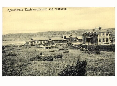 Vykort, "Apelvikens Kustsanatorium vid Varberg." Ekonomibyggnad med vårdpaviljongerna 1 och 2.