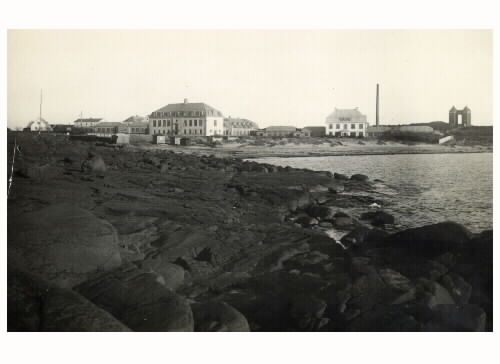 Utsikt från klipphällarna mot Lilla Apelviken och Kustsanatoriet Apelviken med de två vattentornen kallade Albert och Frida. Bilden tagen före 1935.