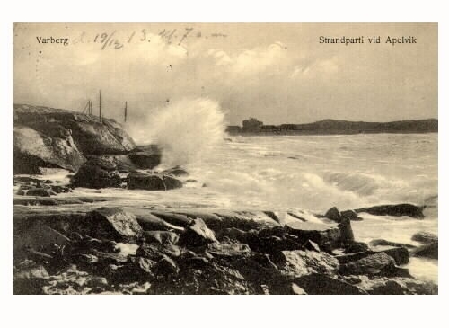 Vykort, "Varberg. Strandparti vid Apelvik." Bränningarna slår upp mot klipporna och i bakgrunden skymtar Kustsanatoriet Apelviken vid stranden.