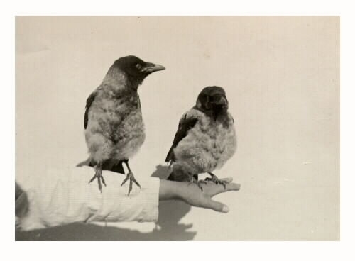 Två tama kråkor som fanns vid Apelvikens Kustsanatorium. De sitter på en utsträckt arm.