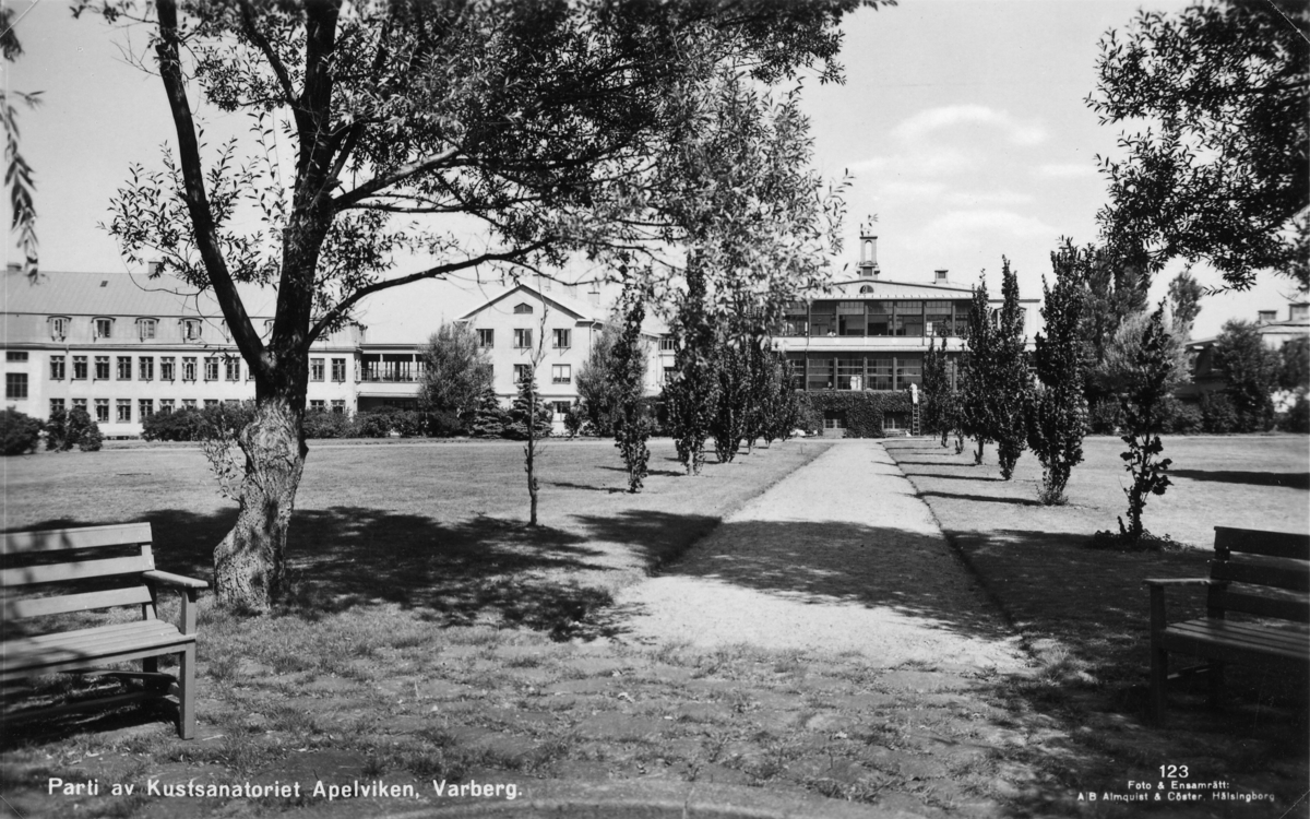 Vykort, "Parti av Kustsanatoriet Apelviken, Varberg". Sett från en rundad sittplats via en allé fram mot byggnaderna. En man står på en stege mot fasaden som täcks av någon klängväxt.