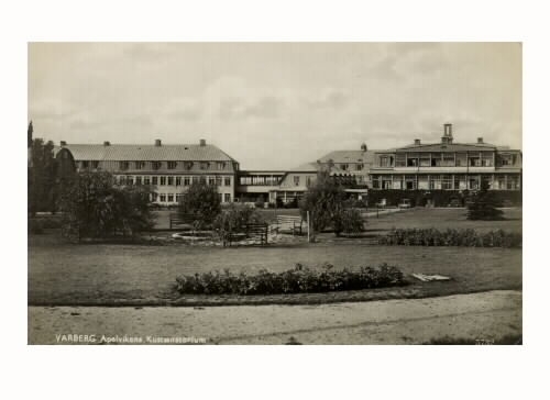 Vykort avsänt 1938, "Varberg, Apelvikens kustsanatorium." Vy från parken mot sanatoriebyggnaderna. I bildens mitt är en sittplats kring en liten rund damm arrangerad.