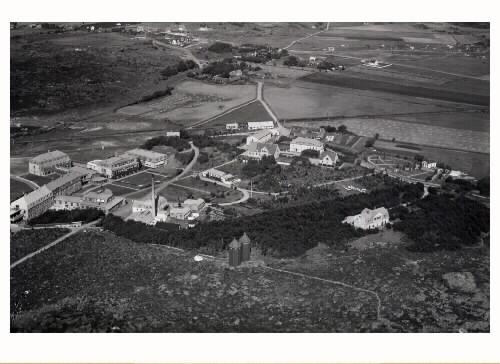 Flygfoto över Kustsanatoriet Apelvikens område. I bildens mitt nedtill syns de två sammanbyggda vattentornen från 1916 respektive 1925 som kallas Albert och Frida.