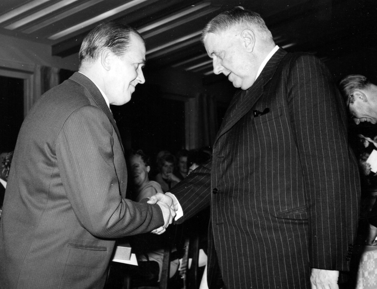 Tvättmästare Åke Nilsson på Kustsanatoriet Apelviken, tar emot en medalj ur landshövding Reimer Johanssons hand.