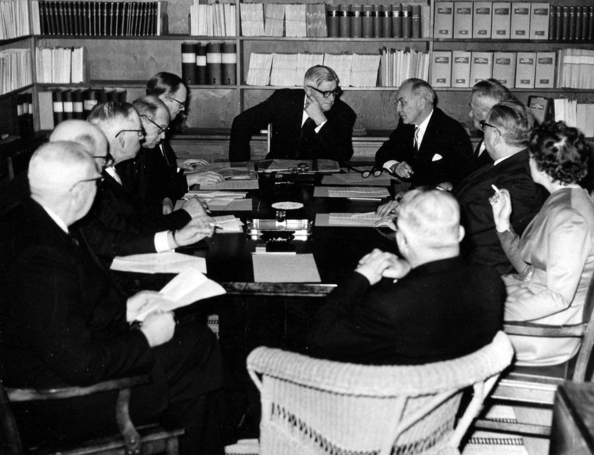 Styrelsesammanträde för Kustsanatoriet Apelviken. Ordförande landshövding Reimer Johansson i bildens mitt samtalar med sanatoriets överläkare Albert Ahlberg till höger.