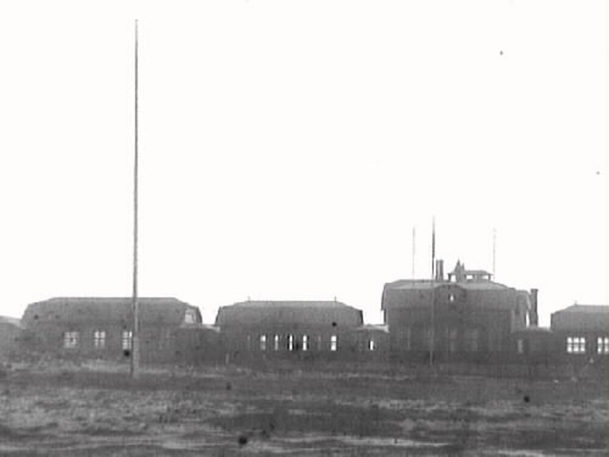 Några av Kustsanatoriet Apelvikens träpaviljonger med en hög flaggstång framför.