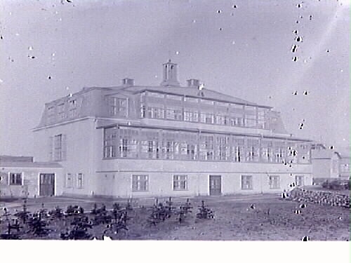 Kustsanatoriet Apelviken, Varberg. Huvudbyggnadens baksidan med solverandorna. Nere till vänster ses nyplanterade granar.