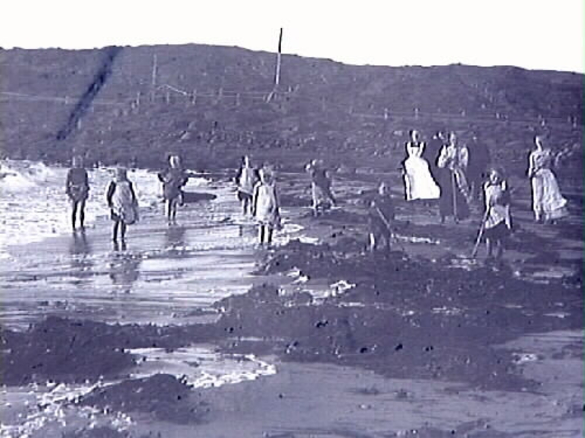 Några barn och vuxna som krattar ihop tång på stranden i Lilla Apelviken år 1903. Sannolikt är det personal och patienter vid Kustsantoriet Apelviken där dr J S Almer börjat bedriva vård av skrofulösa barn, alltså de som led av körteltuberkulos.