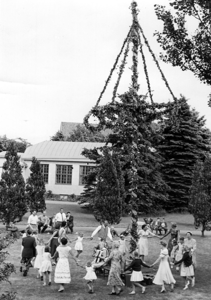 Ringlekar runt midsommarstången på Kustsanatoriet Apelviken under 1950-talet. Till vänster om stången sitter musikerna; en kvinna med dragspel och en man med gitarr. (Se även bildnr KSA39)
