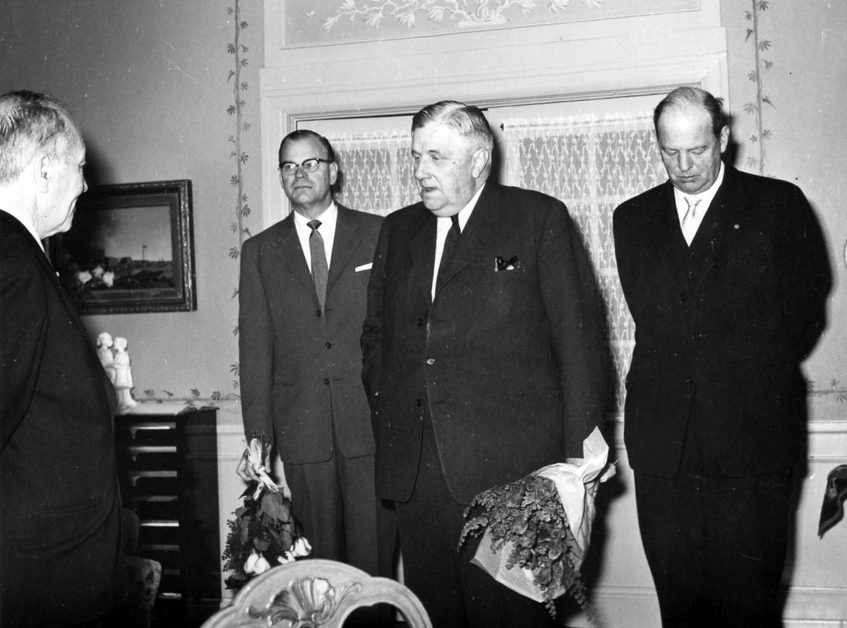 Till vänster står överläkare Albert Ahlberg på Kustsanatoriet Apelviken som troligen uppvaktas i samband 60-årsdagen (född 1899) med blomster av från vänster borgmästare Axel Lindskog, landshövding Reimer Johansson och sanatoriets intendent Harald Liljenberg. De befinner sig i överläkarbostaden.