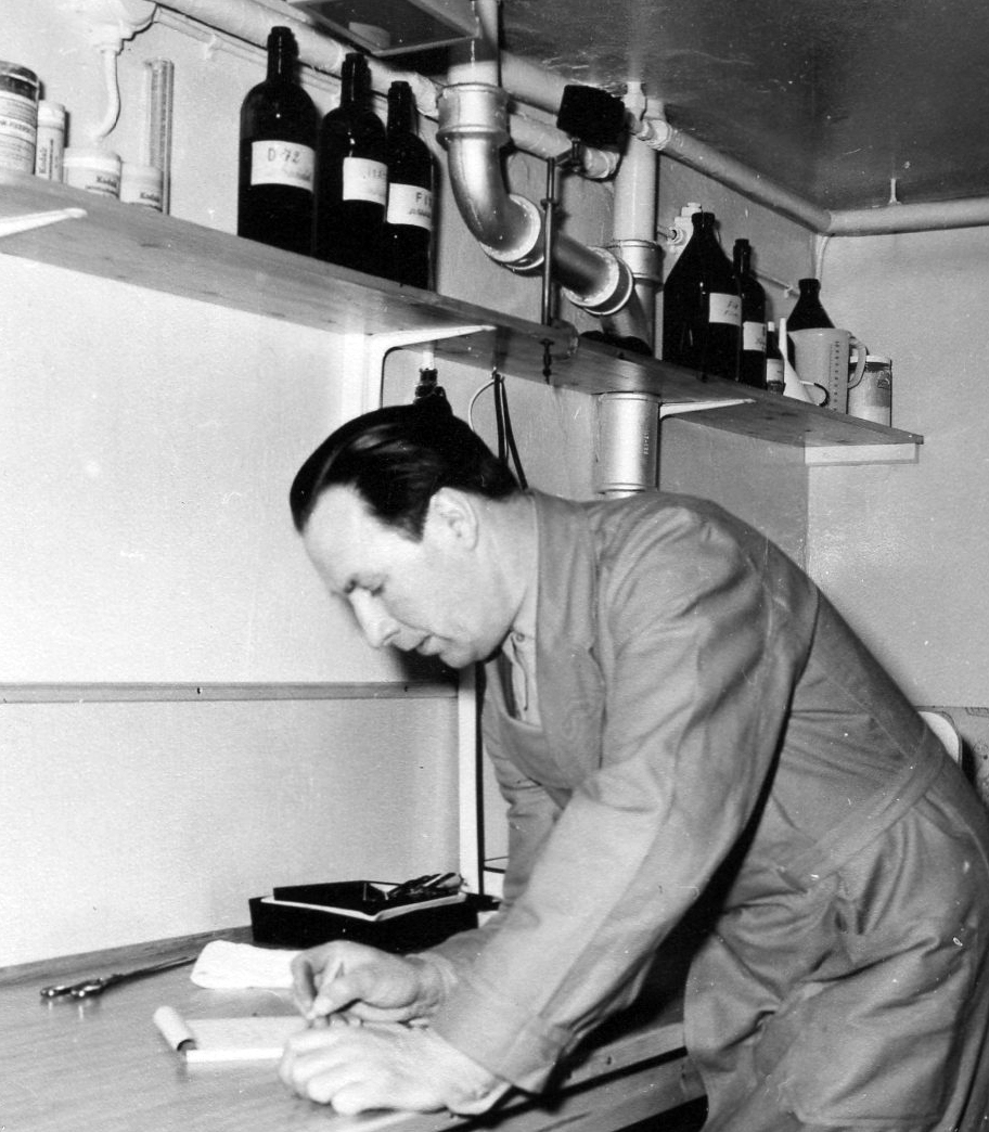 En man som arbetar i fotolaboratoriet på Kustsanatoriet Apelviken, där röntgenfilmer framkallas. (Se även bildnr KSA72)