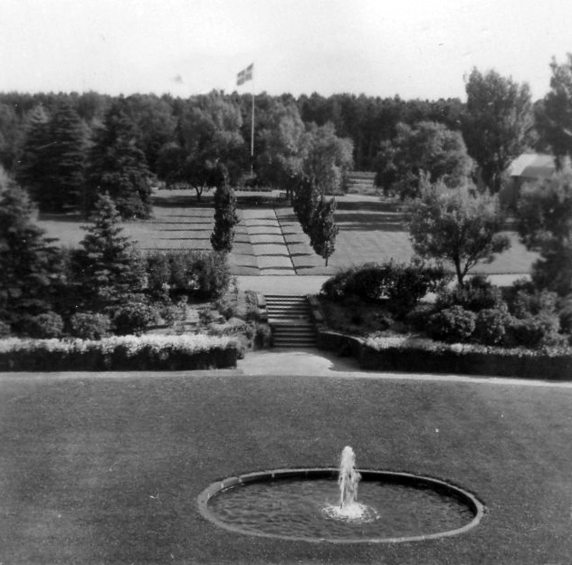 Vy över parkområde på Kustsanatoriet Apelviken med en rund damm med fontän i förgrunden. I dess linje leder trappor mellan träd- och buskrabatter upp till nästa etage och vidare går en allé upp till flaggstången.
