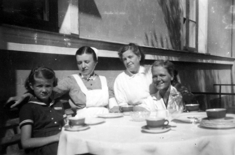 Personal på Kustsanatoriet Apelviken dricker te med en liten flicka i solen vid en husfasad.