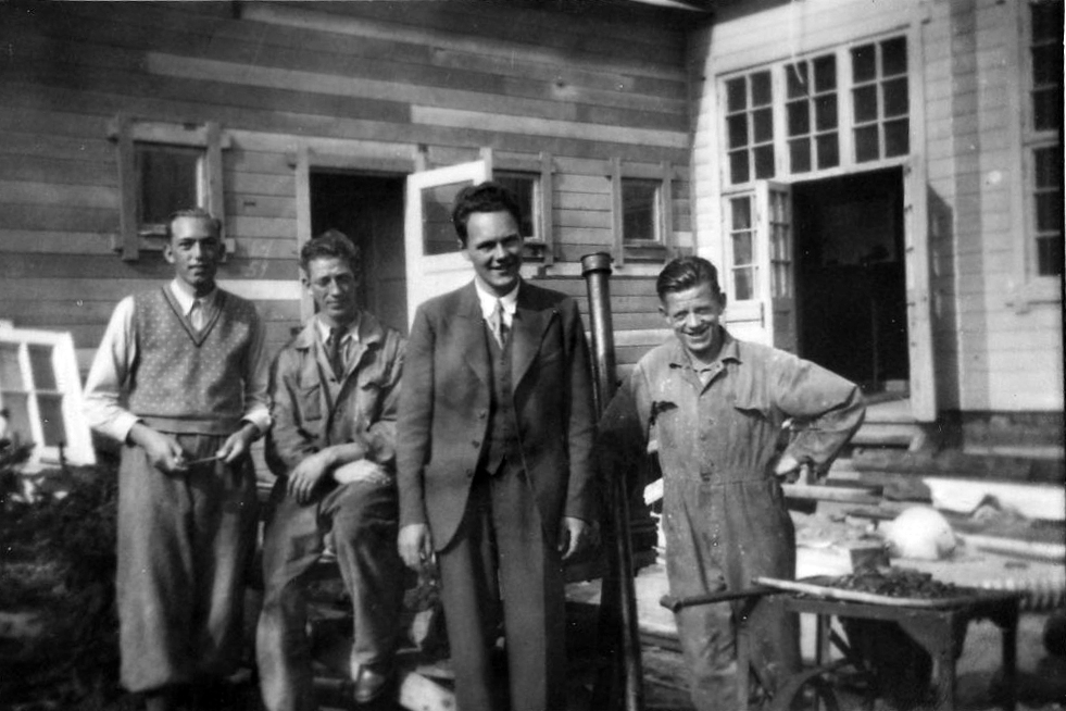 Fyra män står vid en av Kustsanatoriet Apelvikens träbyggnader som är under uppförande. Två är klädda i arbetaroveraller, en i "äppelknyckarbyxor" och en i kostym.