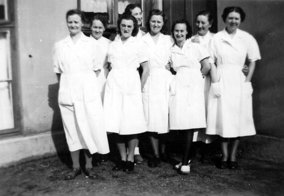 Personal i vita rockar på Kustsanatoriet Apelviken samlade utomhus vid entrén till en byggnad.