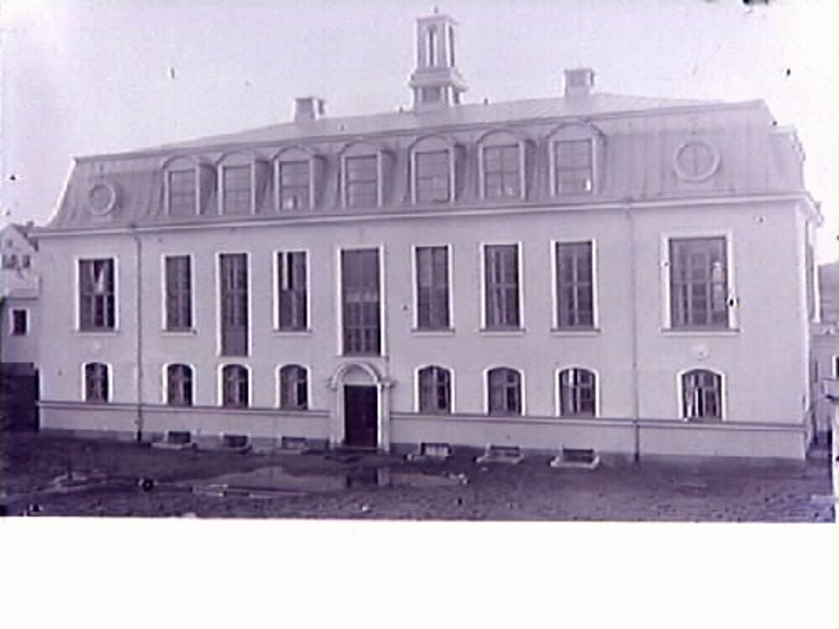 Kustsanatoriet Apelviken, huvudbyggnadens entrésida. Andra våningen rymmer sjuksalar och har därför överdrivet höga fönster för att få in så mycket ljus som möjligt.