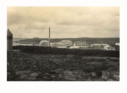 Utsikt över Kustsanatoriet Apelvikens bebyggelse och Lilla Apelviken. I bakgrunden ses Varbergs fästning och sannolikt är det ena vattentornet som skymtar till vänster i bild.