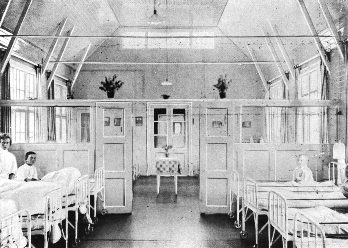 Interiör från en sal i den äldsta paviljongen på Kustsanatoriet Apelviken. Några patienter (barn) och personal i bild.